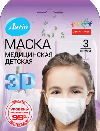 Медицинская маска Латiо 3D для детей от 3-х до 14 лет, специальной трехмерной формы. Маска выполнена из мягкого гипоаллергенного материала. Высокоэффективный фильтр обеспечивает высокую степень защиты. Благодаря специальной трехмерной форме маска плотно прилегает к лицу, обеспечивая дополнительную защиту. Трехмерная форма позволяет создать идеальную форму воздушного кармана, которая сохраняется на протяжении всего времени ношения. Мягкие ушные петли на широкой плоской резинке, надежно фиксируют маску, и не натирают даже при длительном ношении. Время использования до 6 часов.