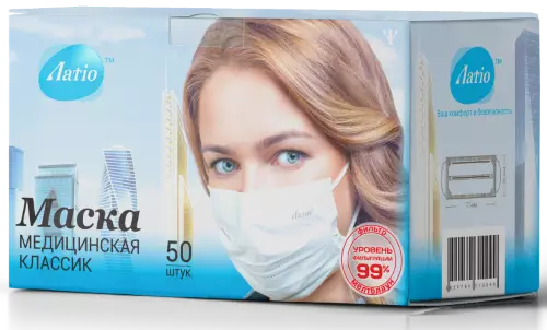 Маска медицинская трехслойная «Латio». Высокоэффективный фильтр обеспечивает высокую степень защиты. Нежный гипоаллергенный материал не затрудняет дыхание. В маске используется уникальный "фиксатор формы" (патент ООО «КИТ» на полезную модель № 110937), который препятствует соприкосновению маски со ртом даже при сильном вдохе. Особая сборка «Омега» формирует оптимальную форму воздушного кармана, и обеспечивает плотное прилегание маски к лицу. Мягкие ушные петли на широкой плоской резинке, надежно фиксируют маску, и не натирают даже при длительном ношении. Время использования до 6 часов.